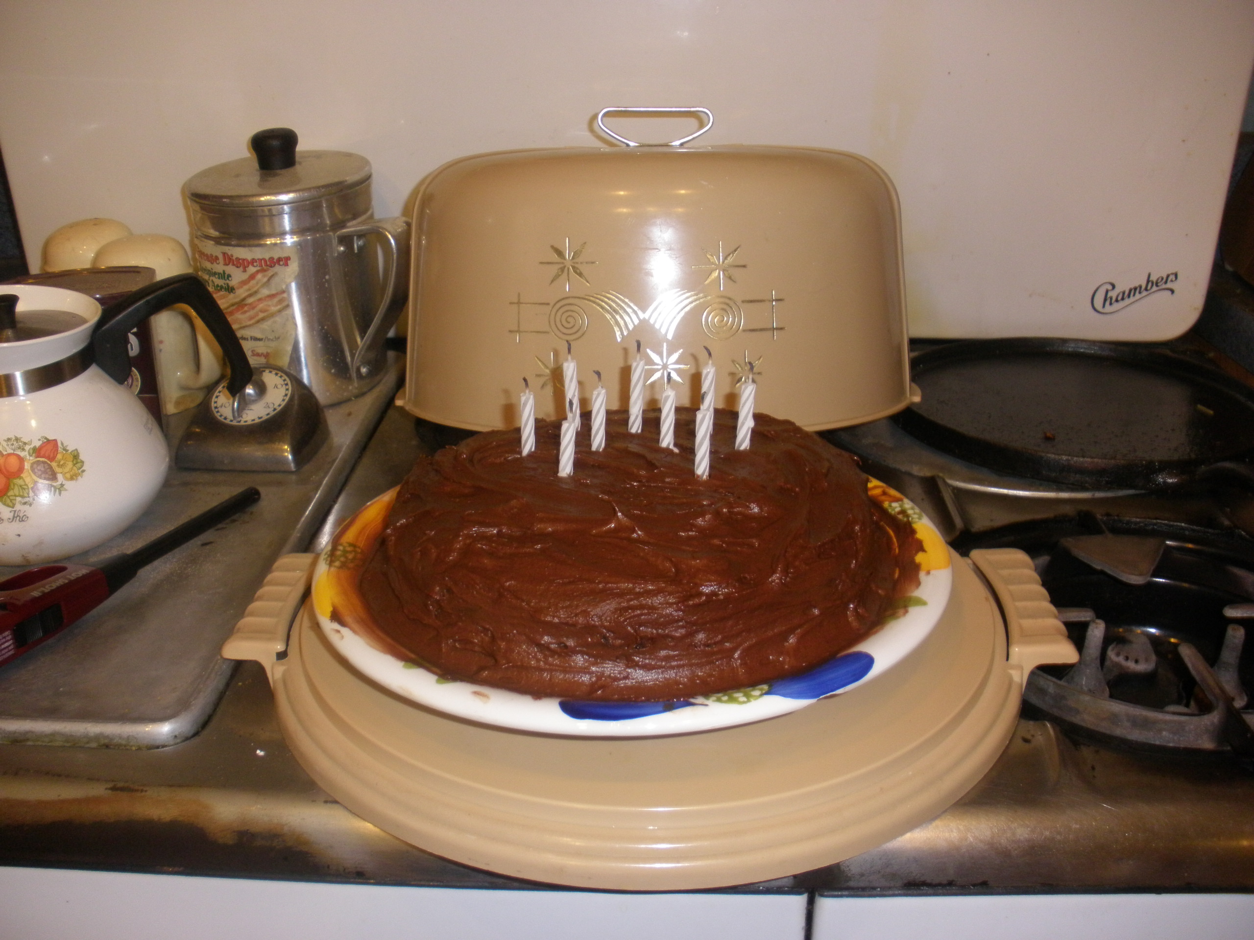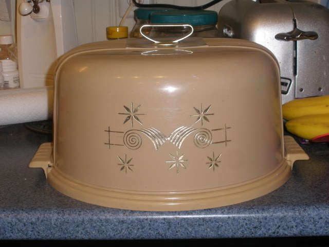 After the cake was cooled and frosted, we placed it in the cake cover/carrier that my mom used when we were growing up.  She and my Dad are in the process of downsizing their household, so I was given this a couple of years ago.  We don’t use it very often, but I have very happy memories of birthday cakes being stored in here when I was a kid.