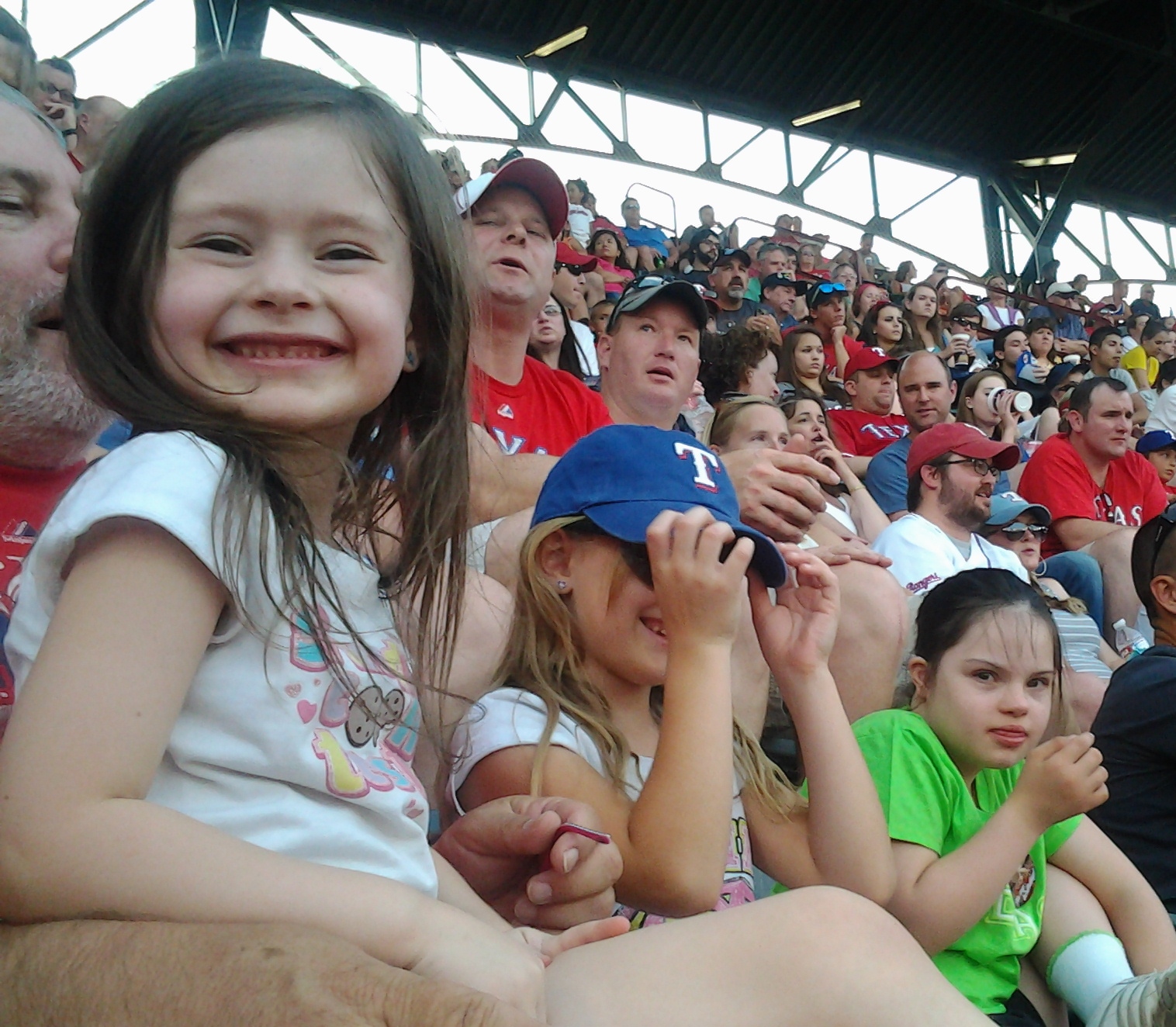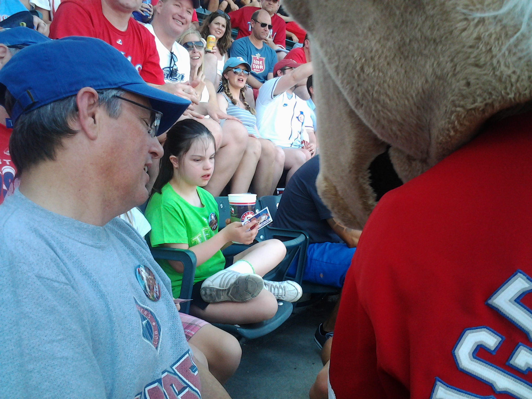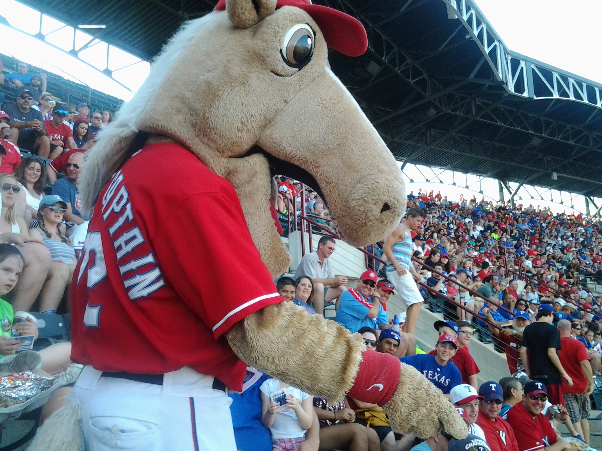 When looking up information about the Rangers’ mascot, I discovered that – also for a modest fee – you can have “Captain Ranger” come to your seat and visit with your group (they set it all up in advance, and he makes the rounds during the 2nd and 3rd innings). Since our nephew was coming with his family, I thought it might be a nice surprise for all of the kids.