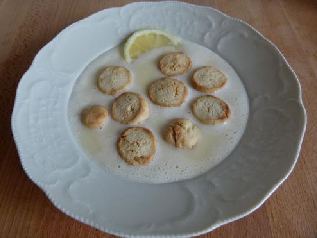 Serve bowl of cold soup with a handful of kammerjunker biscuits on top.