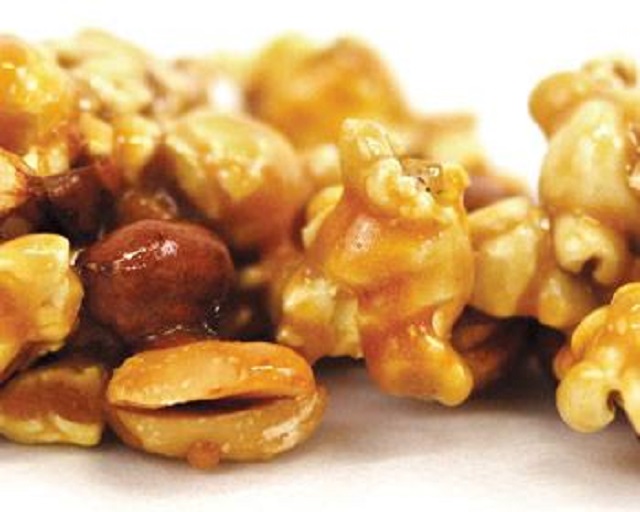 Pour hot syrup over popped corn and nuts, stirring to combine well.